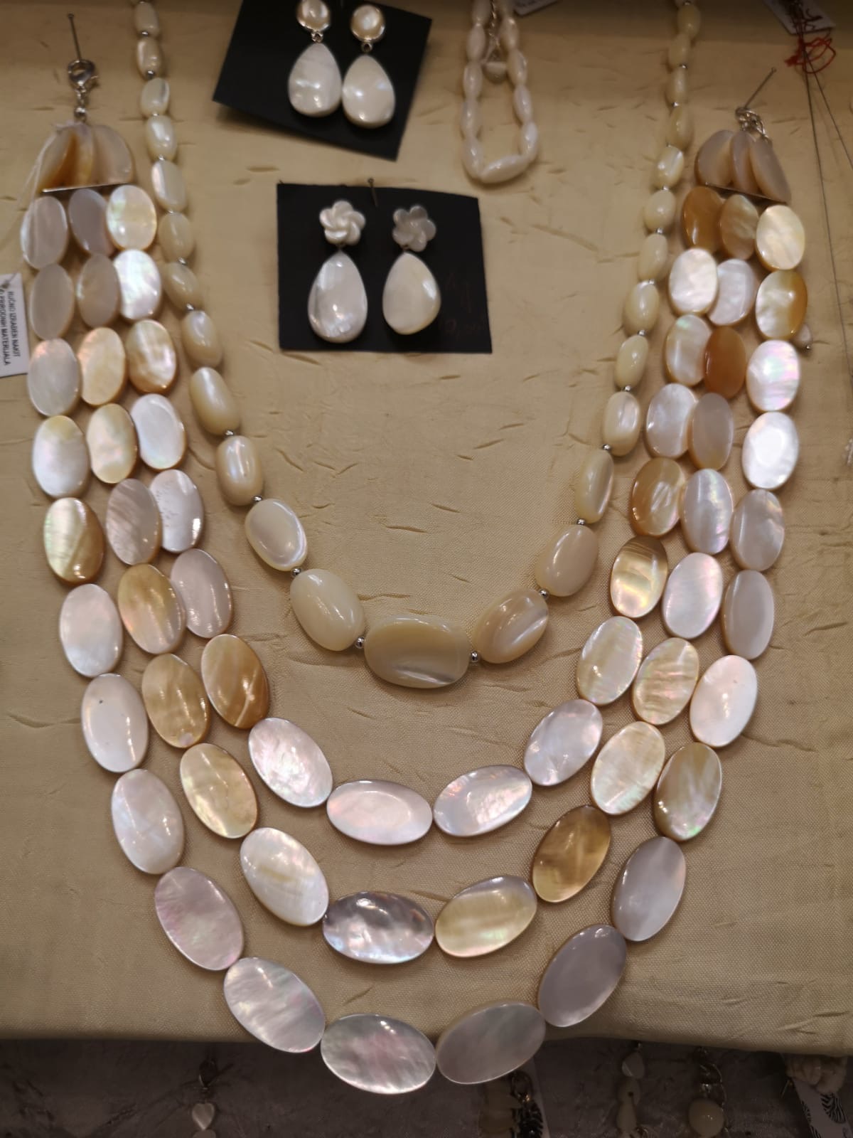 Ogrlica od sedefa. Dužina: 55 cm. Izabrali smo tri ogrlice iz naše proizvodnje, koje najviše sliče SEKANCIMA. Mogu se kombinirati sa naušnicama (11,00 EURa) ili sa narukvicom na gumicu ili kopču(obje po 14,00 EURa.